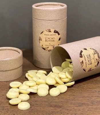 Cacao butter is the combined butter made from all of the fat-based components in whole cacao beans. This is made by pressing the milled cacao beans to separate the cacao butter from the non-fat cacao mass or solid. The most common use for cacao butter is for making chocolate, however, cacao butter is a great option for making desserts at home, especially in raw vegan recipes. Cacao butter is also used in many cosmetic products, such as moisturising lotions. Made from raw cacao beans, cacao butter is packed with plenty of antioxidants and healthy natural fats.